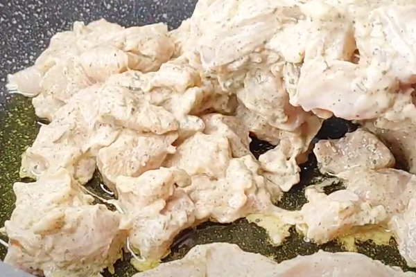 یک تابه چدنی یا گریل را روی حرارت متوسط گرم کنید و مقداری روغن در آن بریزید. تکه‌های مرغ مرینت‌شده را در تابه بچینید و اجازه دهید هر طرف حدود ۵ تا ۷ دقیقه سرخ شود تا کاملاً طلایی و برشته شود. در حین پخت، مرتباً مرغ را زیر و رو کنید تا تمام قسمت‌ها یکنواخت بپزند.