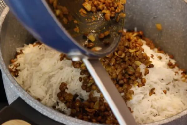 اضافه کردن عدس به برنج برای تهیه عدس پلوی دمی