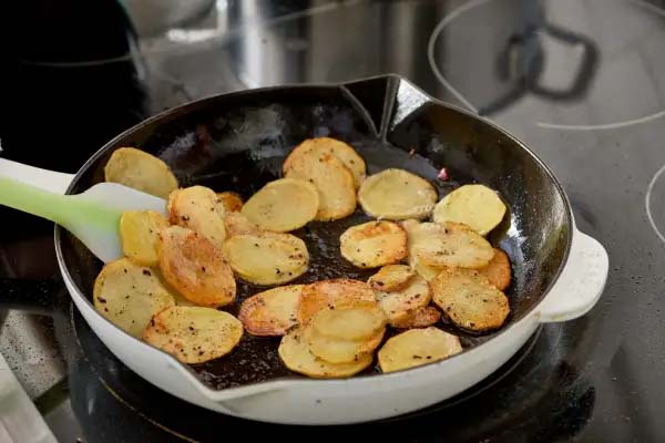 ۵. بیکن و سیب زمینی‌ها را داخل تابه برگردانید