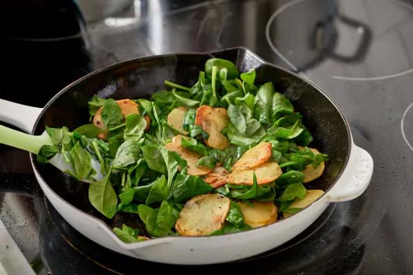 تفت دادن اسفناج، بیکن و سیب زمینی در تابه برای تهیه فریتاتای ساده