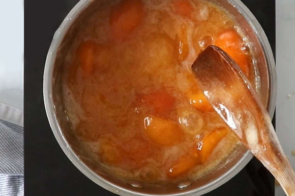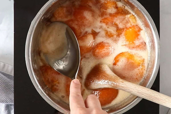 قابلمه را به مدت ۱۰ تا ۱۵ دقیقه روی حرارت متوسط ​​بگذارید تا میوه کم‌کم نرم شود؛ هر از گاهی با قاشق چوبی دسته بلند، زردآلوها را هم بزنید. با افزایش حرارت، زردآلو به تدریج نرم و به حالت مایع تبدیل می‌شود و برای جلوگیری از تبخیر شدن مایع، در قابلمه را ببندید.