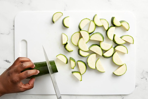 انتهای کدو سبز را ببرید، سپس آن را از طول به دو نیم تقسیم کنید. پس از آن، هر نیمه را به صورت عرضی برش زده و به قطعات هلالی شکل با ضخامت دلخواه خرد کنید.