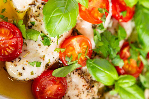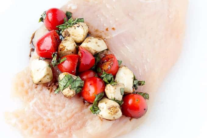 قبل از هر کاری فر را از قبل با دمای ۲۰۴ درجه سانتیگراد گرم کنید. برای تهیه مایه فیلینگ مرغ شکم پر، در یک کاسه کوچک، پنیر موزارلا تازه مرواریدی، ریحان خردشده، گوجهفرنگی نصفشده، سرکه، نمک و فلفل را اضافه و به آرامی مخلوط کنید؛ به این مخلوط «سالاد کاپرزه» هم گفته میشود.