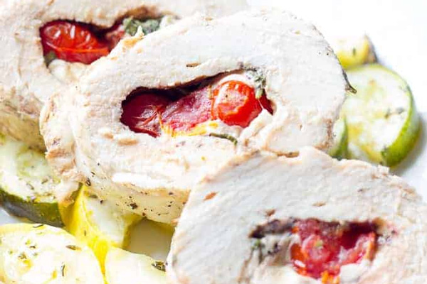 مایه فیلینگ را بین دو سینه مرغ تقسیم کنید؛ فیلینگ باید از لبههای مرغ فاصله مناسب داشته باشد تا بیرون نریزد. مانند تصویر بالا، دو لبه سینه مرغ را رول کنید و از ۲ یا ۳ خلال دندان برای بستن سینه مرغ استفاده کنید. سینه مرغ پرشده را در مرکز ورقه فویل و روی کدوهای مزهدار شده قرار دهید و با کمی نمک و فلفل مزهدار کنید.