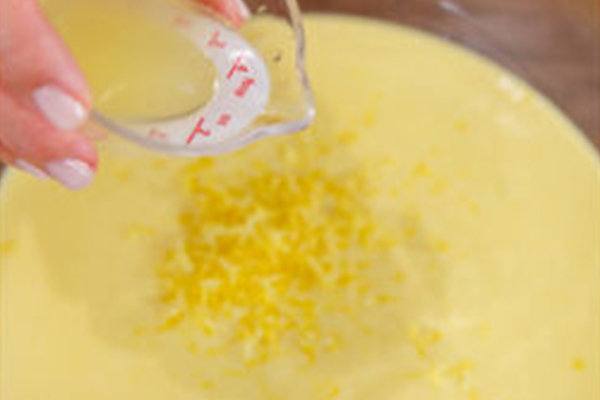 نصف پوست یک لیمو را رنده و به مایه اضافه کنید؛ فقط قسمت زرد و خوش‌عطر پوست لیمو را رنده کنید و از رنده کردن با بخش سفید و تلخ آن خودداری کنید. آب لیمو را در یک کاسه کوچک بگیرید، دو قاشق غذاخوری از آن را اندازه بگیرید و به مایه اضافه کنید. در پایان، مجدد همه مواد را خوب با همزن دستی مخلوط کرده و کنار بگذارید.