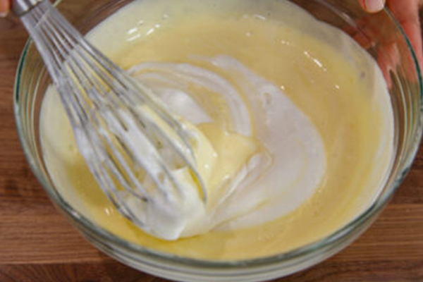 مرحله هشتم: افزودن سفیده زده‌شده به مایه پنیر چیز کیک