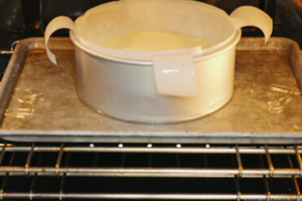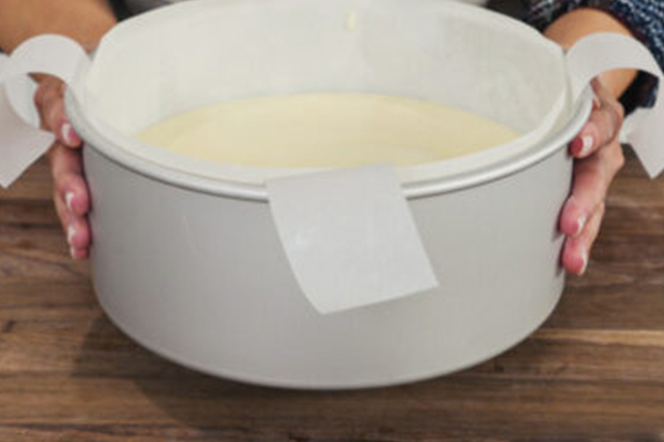 از یک قالب کیک (۲۳ سانتی‌متری) با ارتفاع (۱۰ سانتی‌متر) استفاده کنید؛ کاغذ روغنی را به‌گونه‌ای ببرید که کف و دیواره‌های قالب را بپوشاند؛ یک دایره به قطر ۲۳ سانتی‌متر برای کف قالب و یک نوار مستطیلی به اندازه ۱۰ در ۷۶ سانتی‌متر برای دیواره‌ قالب ببرید؛ علاوه بر این، دو نوار کاغذی به اندازه ۵ در ۷۶ سانتی‌متر آماده کنید تا بعداً از آن‌ها به عنوان «دسته» برای بیرون آوردن چیز کیک پخته‌شده از قالب استفاده کنید.