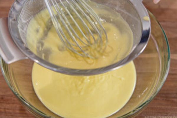 با استفاده از یک الک ریز، ۲/۳ پیمانه آرد کیک را روی مایه الک کنید، سپس با همزن دستی، آرد و مایه را به‌خوبی مخلوط کنید تا یکدست شوند. مایه چیز کیک را دوباره از همان صافی ریز عبور دهید و داخل یک کاسه بزرگ و تمیز بریزید تا بافت مایه نرم و ابریشمی شود.