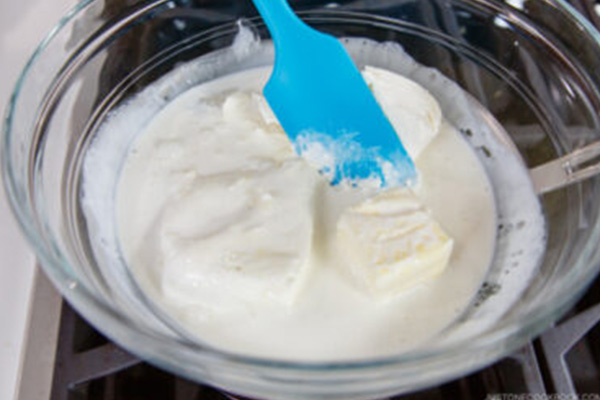 در یک کاسه بزرگ، ۳۰۰ گرم پنیر خامه‌ای، ۶۰ گرم کره، ۲۰۰ میلی‌لیتر خامه صبحانه و ۶۰ گرم شکر بریزید؛ کاسه را روی قابلمه‌ی حاوی آب در حال جوش آرام (که در مرحله قبل آماده کردید) قرار دهید. دقت کنید که حرارت دادن به روش بن ماری باعث گرم و نرم شدن پنیر خامه‌ای و کره می‌شود، بنابراین نیازی نیست این مواد را از قبل به دمای محیط برسانید.