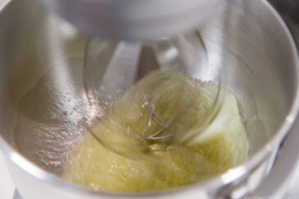 بعد از اینکه تمام شکر اضافه شد، سرعت همزن را بالا ببرید و آن‌قدر بزنید تا سفیده‌ها فرم بگیرند. زمانی که سری همزن را بالا می‌آورید و برمی‌گردانید، سفیده‌ها باید به همزن بچسبند و شکل خود را حفظ کنند، اما نوک آن‌ها کمی به عقب خم شود.