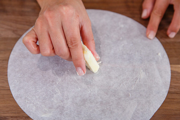 با ۱۵ گرم کره‌ پاستوریزه حیوانی ، قالب و یک طرف کاغذهای بریده‌شده را چرب کنید؛ دو نوار کاغذی را به‌صورت ضربدری کف قالب قرار دهید تا شکل «X» بگیرند و سر آزاد آن‌ها از قالب بیرون بماند؛ سپس دایره و نوار مستطیلی کاغذ روغنی را داخل قالب بگذارید، به‌طوری که سمت چرب‌شده‌ی دایره رو به پایین و سمت چرب‌شده‌ی نوار مستطیلی رو به قالب باشد.